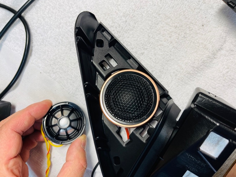 ハーマンカードンのサウンドシステムは、3wayセパレートスピーカーと、合計10個以上のスピーカーを装備している場合が多く、その全てを交換することが困難な場合は、ドアのスピーカー(ミッドレンジ/スコーカー)の交換が最も音質向上効果が高いです。