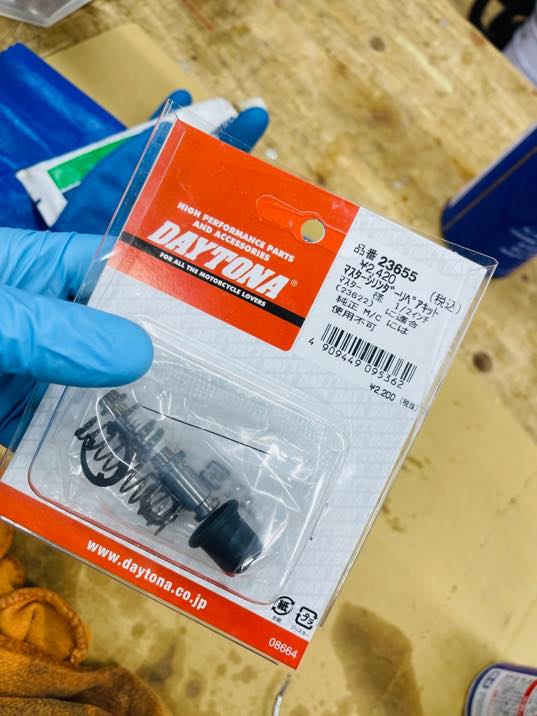 例のごとく、BUELL/HARLEY純正部品は入手困難なので、代用品を流用するわけですが、こちらのデイトナのマスターシリンダーリペアキット23655では、傘状の小さいリング状のパッキンとスプリングしか使えませんでした。泣