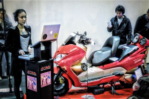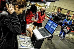 MTXのオーディオ搭載のビッグスクーター(フォルツァ)ターンテーブルとMACをつないで、DJイクちゃんがプレイ。