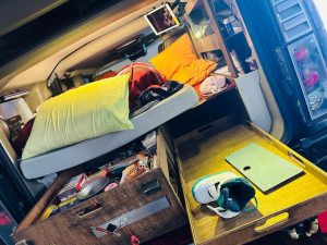 幅60センチくらいのベッドは、キャンプ用のエアマットなどがピッタリのサイズで様々な汎用品が使えるのも便利なポイント。
