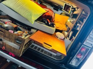 セカンドシートを畳んで、一人がまっすぐ伸びて寝れる環境を作りました。