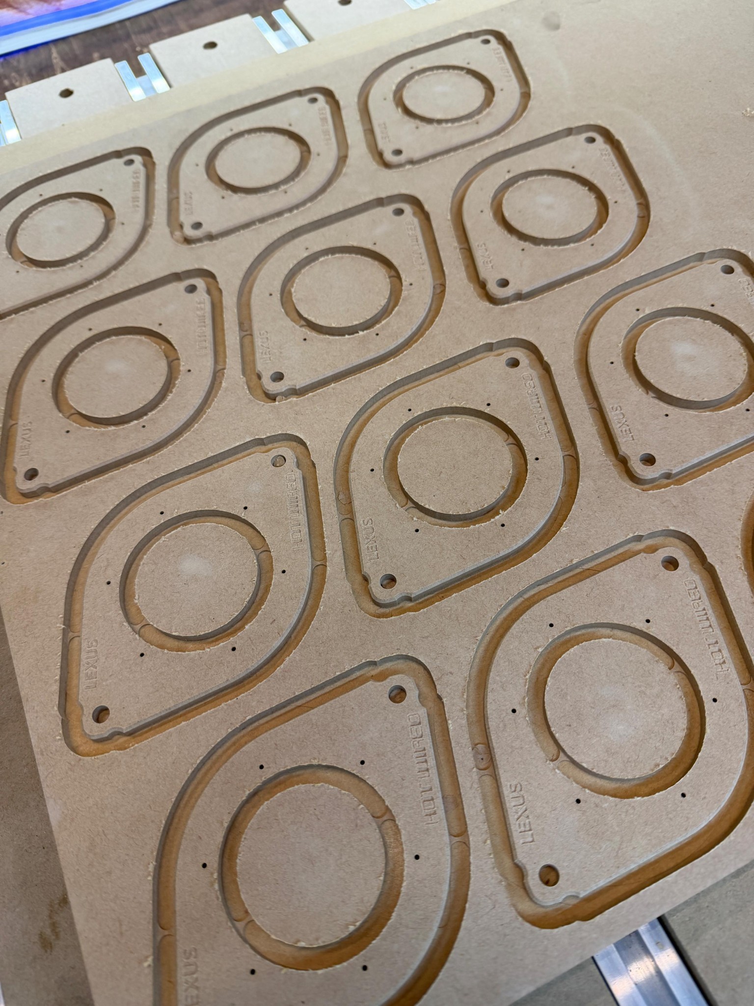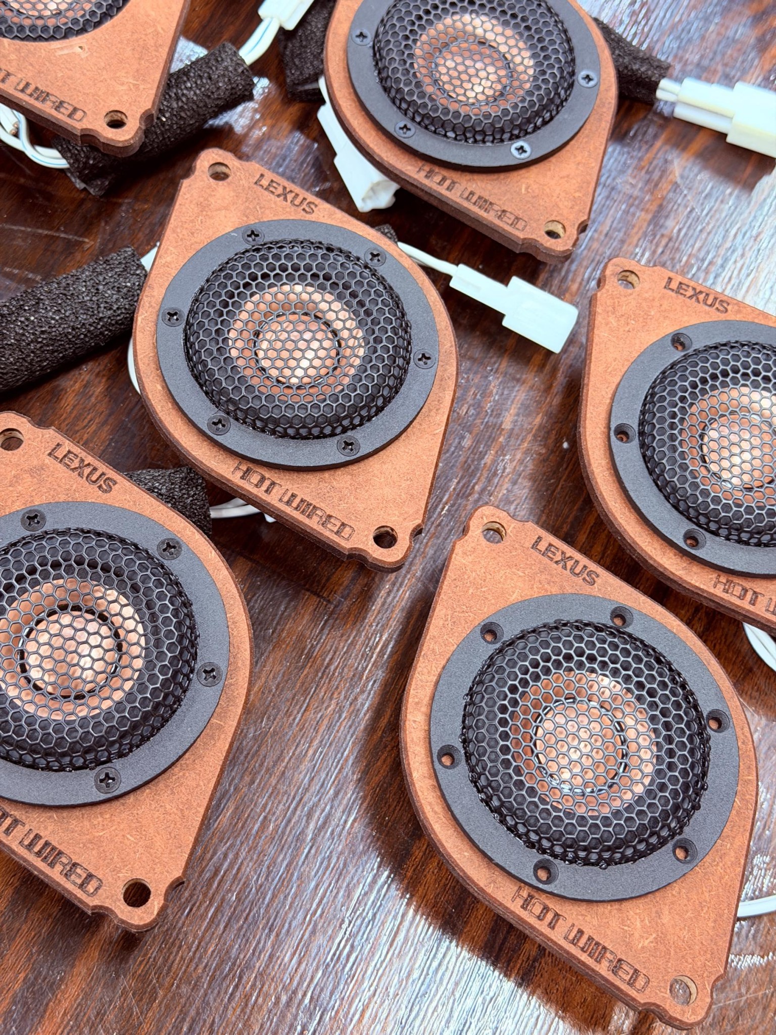 レクサス各車種のマスターの木型を用意しており、単にサイズが合い、取付可能というだけではなく、高さやサイズを0.1ミリ単位でぴったりサイズのリングや理想的なバッフルを設計して、自社で製造しており、木材から削り出して、防水加工を施しています。